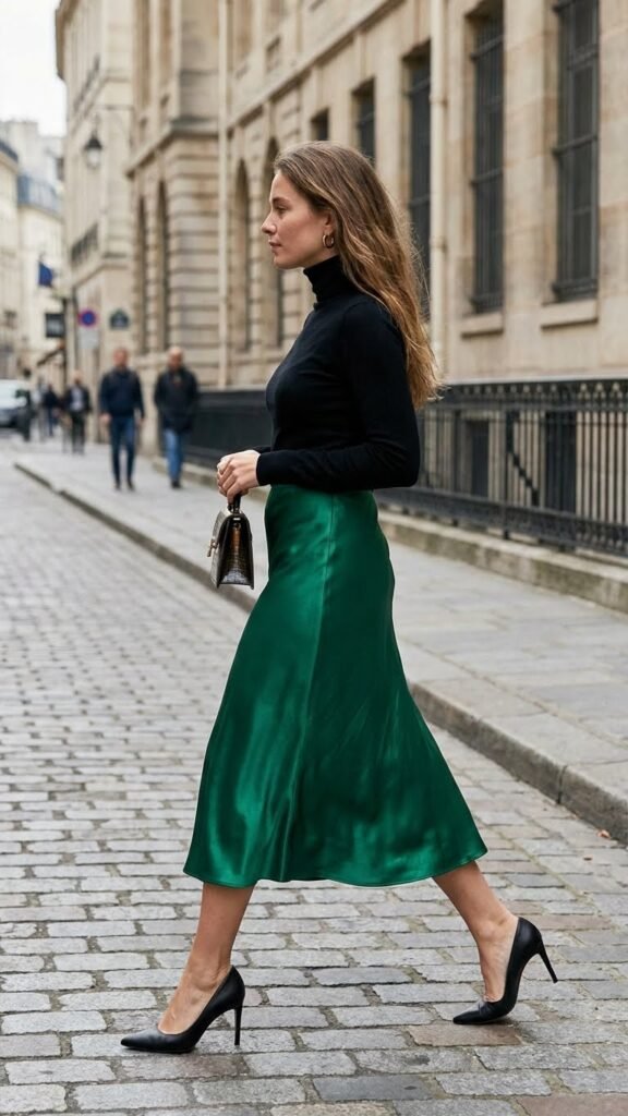 This combo is giving elegant, intellectual, slightly mysterious stranger at a gallery opening. A satin midi skirt in a jewel tone like emerald, burgundy, or navy photographs beautifully and catches the light in the most flattering way. Top it with a slim-fitting turtleneck for that polished European aesthetic.