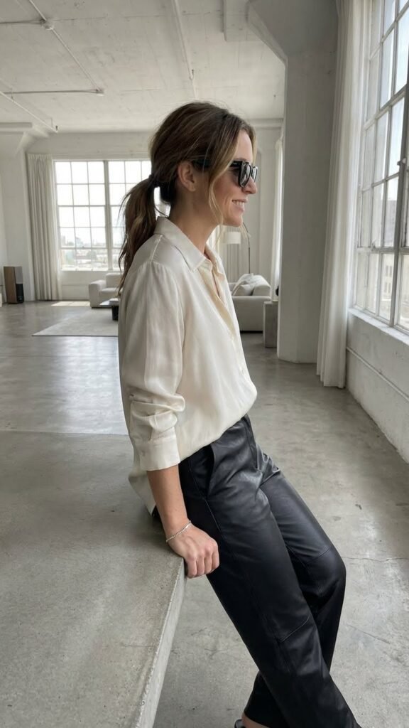 Pair them with a silk blouse in a complementary color, tucked in to show off your waist. The blouse softens the leather’s edge while the leather gives the silk some attitude. Add heeled ankle boots or strappy sandals depending on the season, and you’ve got a look that feels effortlessly cool. IMO this is one of the most underrated cocktail combinations.