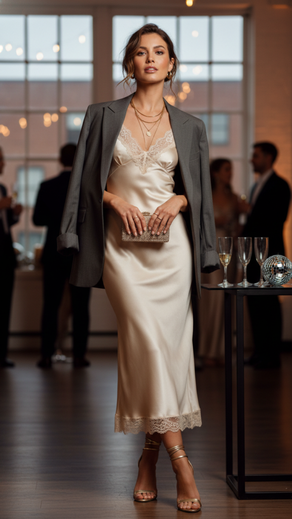 The slip dress is that piece that looks way more expensive than it probably was. It drapes beautifully, it’s comfortable, and it works for literally any party vibe from casual to fancy.