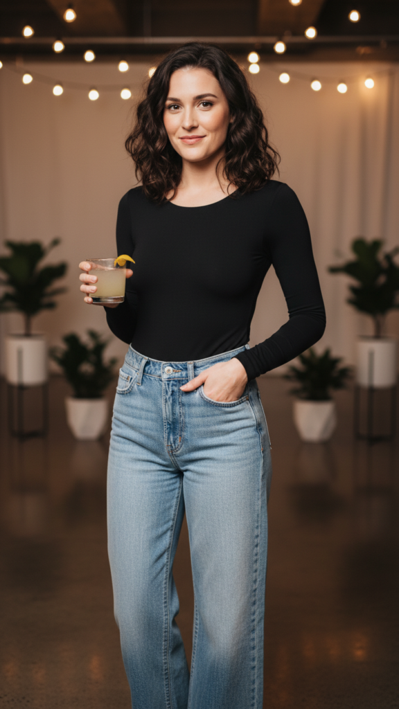 The key here is fit. Go for a high waisted style that hugs in the right places but still lets you breathe because nobody wants to be adjusting their pants all night. Throw on some chunky gold hoops and you’re done. This look screams effortless cool, and honestly? It takes about five minutes to throw together.