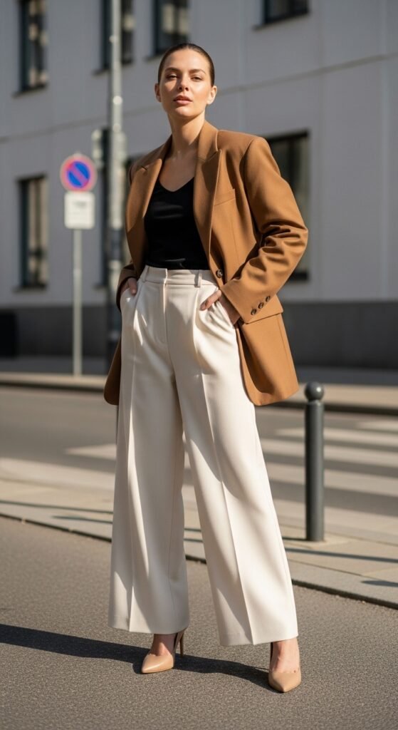 This is the look that says “I have my life together” even when you absolutely do not. An oversized blazer in camel, black, or even a soft blush thrown over your cream trousers instantly elevates the whole outfit. The proportions are everything here. Think structured on top, flowy on the bottom.