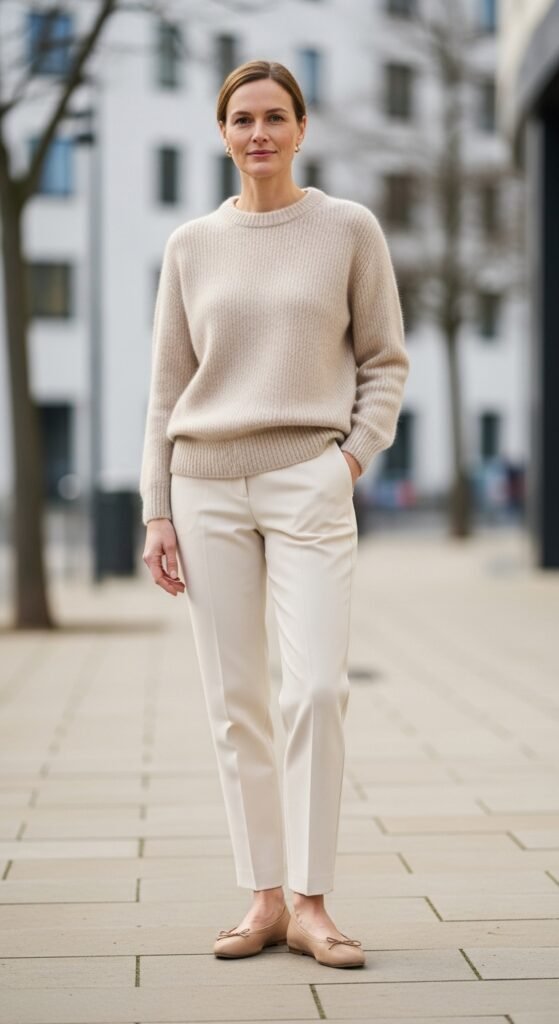 When comfort meets elegance, you get this outfit. A cashmere sweater in a soft neutral like oatmeal, powder blue, or even a muted lavender creates such a dreamy palette with cream trousers. The texture alone makes you look expensive, even if the sweater was a sale find.
