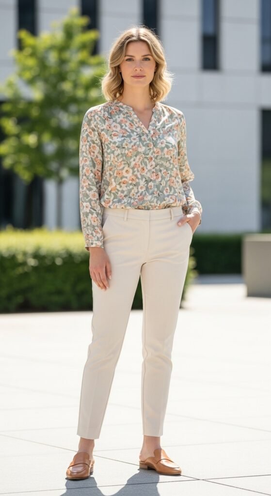 Want to add some visual interest without going overboard? A printed blouse is your best friend. Think subtle florals, abstract patterns, or even a classic polka dot. The cream trousers act as a neutral canvas, letting your top do the talking.