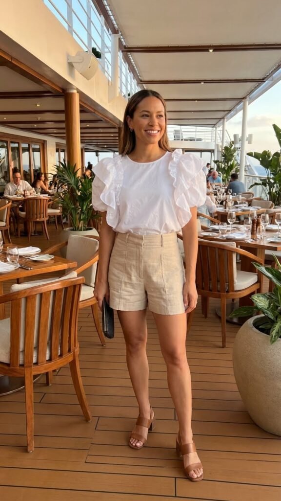 Pair them with a statement blouse, maybe something with dramatic sleeves, a bow detail, or interesting texture, and the outfit immediately levels up. This combo is perfect for those nights when the dress code is smart casual but you still want to look put together. A block heel sandal keeps things comfortable for walking around the ship afterward, and a sleek clutch adds that finishing touch. Just make sure to check your specific dining venue’s dress code because some main dining rooms have rules about shorts, even cute ones.