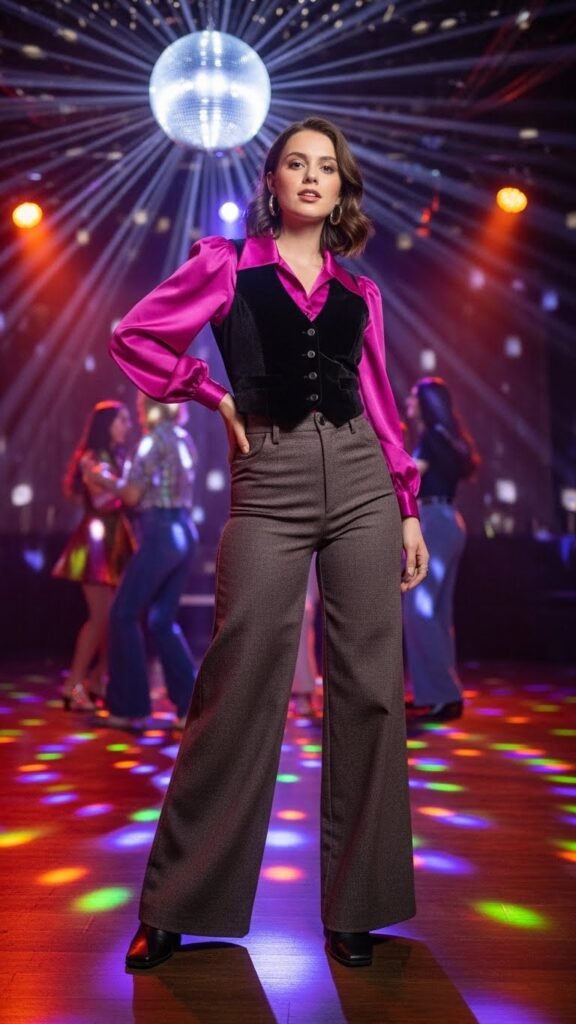You can go subtle with a matching vest and pants set, or mix it up with contrasting textures. A velvet vest over a satin blouse? Chef’s kiss. This outfit works whether you’re going for refined disco elegance or more of a rock and roll adjacent vibe.