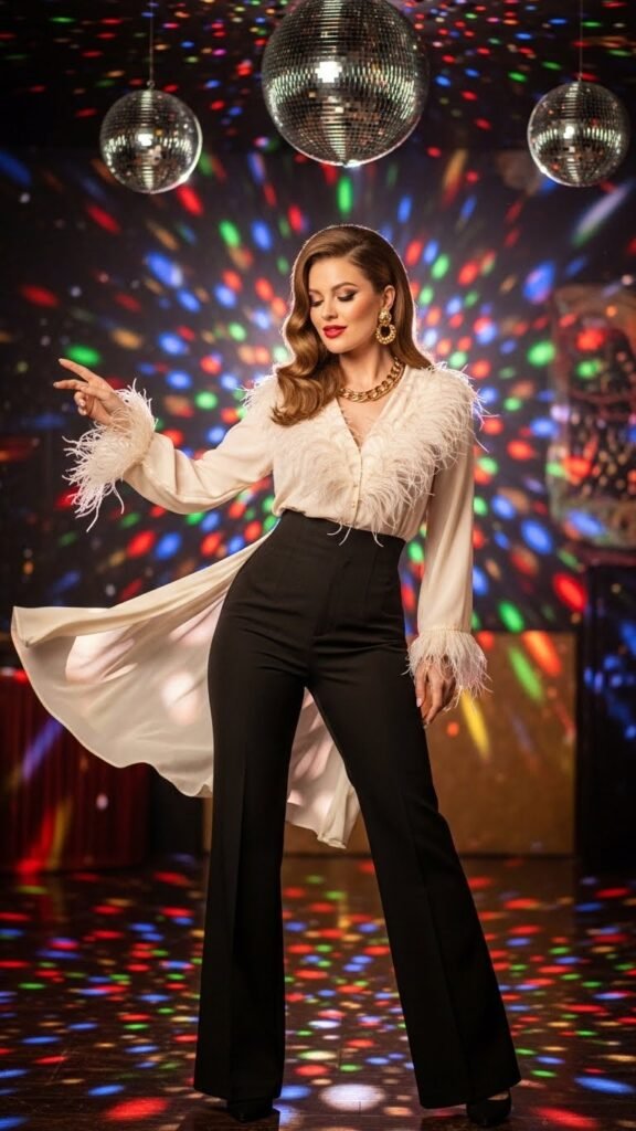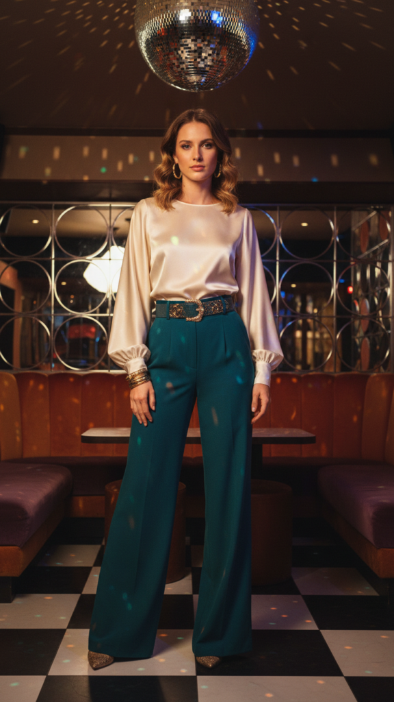 The satin catches light beautifully, which means you’ll still sparkle under those disco lights. Unbutton the top button or two for that relaxed Studio 54 energy. Some people tie the blouse at the waist, which also works if your pants sit super high. Either way, this outfit says “I’m stylish and I definitely know who Donna Summer is.”