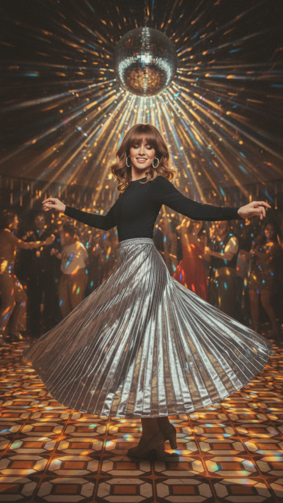 Maxi skirts don’t get enough credit in the disco conversation, but hear me out. A metallic pleated maxi skirt swishes when you walk, catches every light in the room, and honestly makes you feel like a goddess. It’s giving glamour without trying too hard.