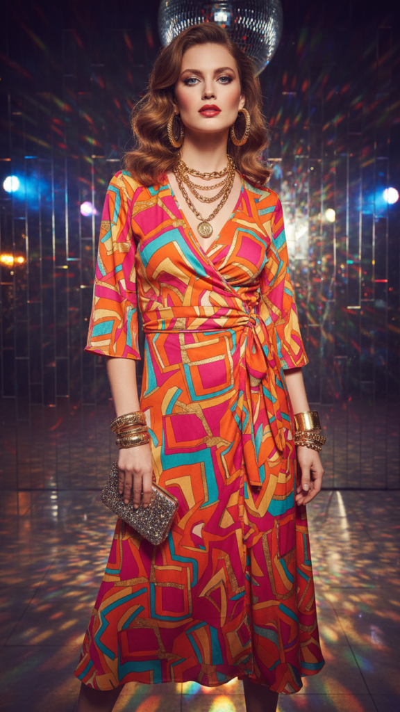 The wrap dress is a classic for good reason. It flatters basically everyone, it’s comfortable, and it moves beautifully when you dance. For disco vibes, choose one in a bold print or shimmery fabric. Those swirly abstract patterns from the 70s are perfect here.