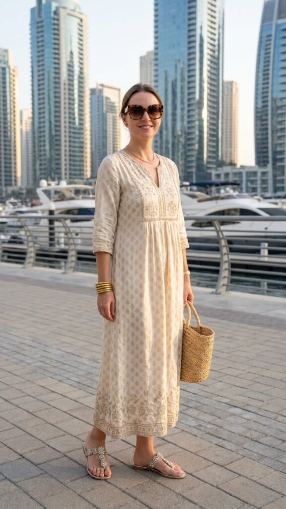 When in doubt, go neutral. An all-neutral outfit in creams, tans, or beiges is inherently chic and photographs beautifully against Dubai’s golden desert landscapes and modern architecture.