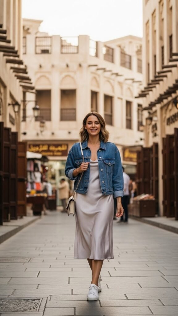 The slip dress alone might feel too dressy, but the denim jacket balances it out and adds a layer for overly air-conditioned spaces (because Dubai’s indoor AC is no joke). Choose a dress in a pretty color like sage green, dusty rose, or classic black.
