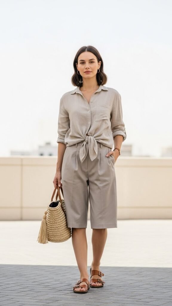 Style them with a loose linen button-down tucked in at the front or tied at the waist. This creates a relaxed but intentional silhouette that’s comfortable for all-day wear. Neutral colors like tan, white, or navy work best and keep the look sophisticated.