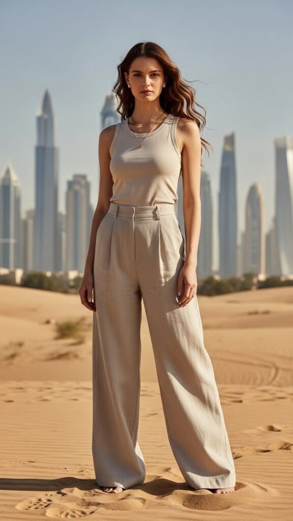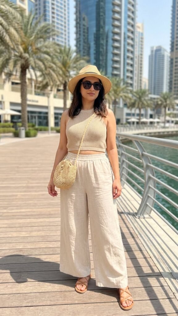 If dresses aren’t your vibe, wide-leg linen pants are about to become your best friend. They’re breezy, they photograph beautifully, and they give major “I summer in the Mediterranean” energy even when you’re just grabbing açai bowls in JBR.