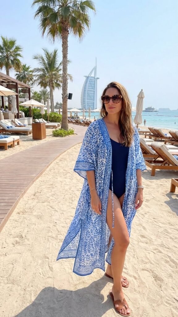 Here’s where Dubai’s beach club culture comes in. A flowy kaftan or cover-up over your swimsuit isn’t just practical, it’s literally essential for transitioning from pool to lunch without a full outfit change.