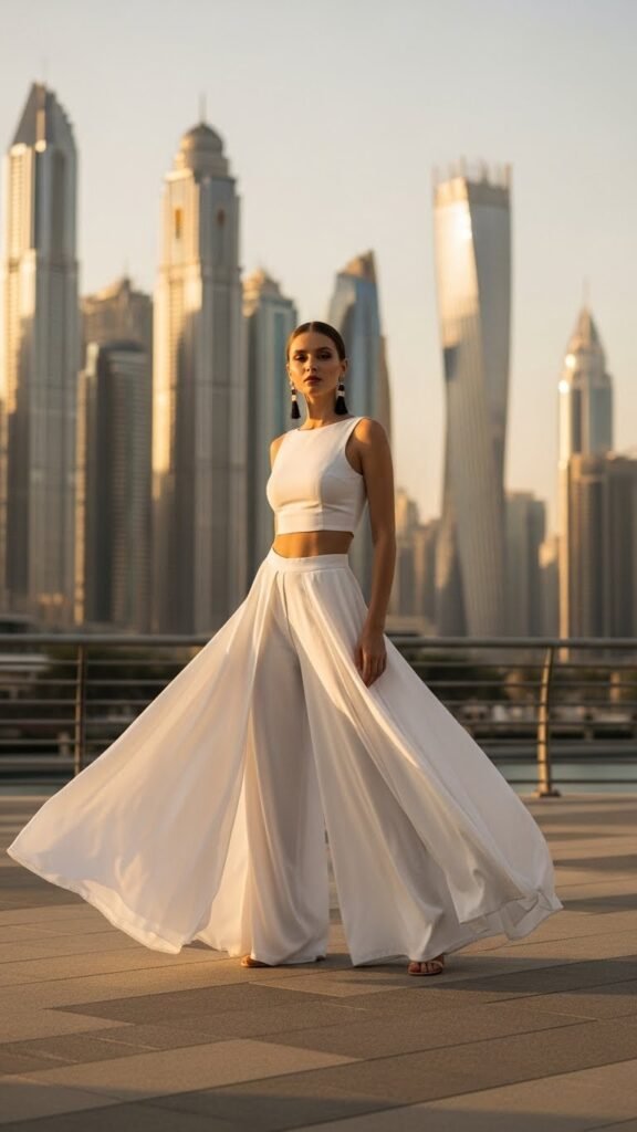 Palazzo pants are basically wide-leg pants’ even more dramatic sister, and they’re absolutely stunning for Dubai. The exaggerated silhouette photographs like a dream, especially with the city’s incredible architecture as your backdrop.