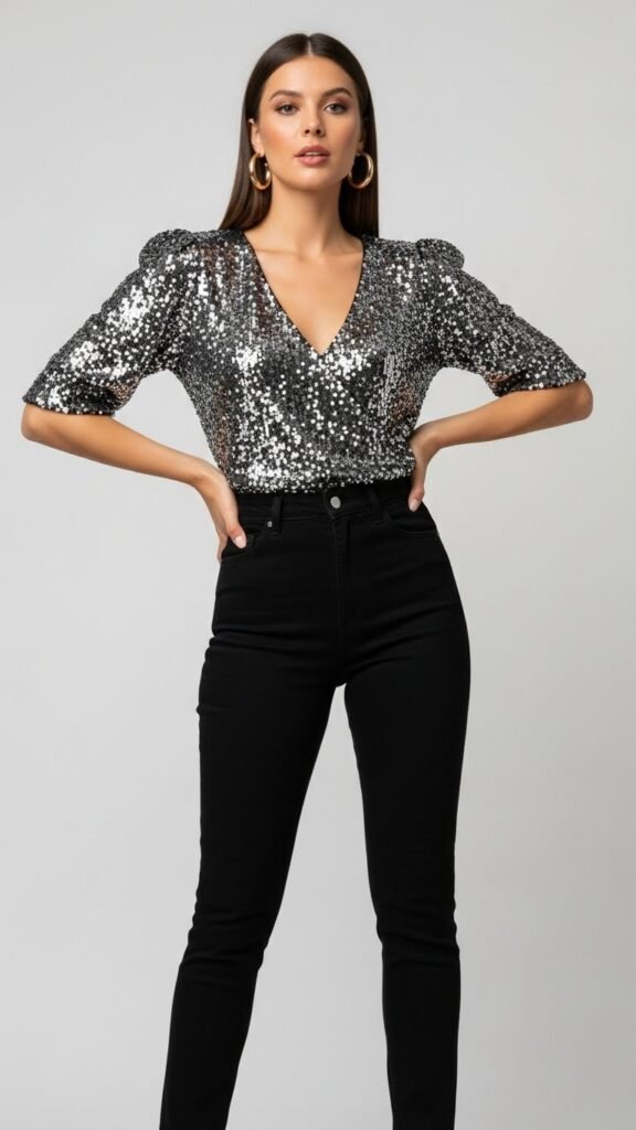 Finish with chunky sneakers or strappy sandals depending on your comfort threshold. This look is perfect for warmer nights or heated indoor parties where you don’t need layers.