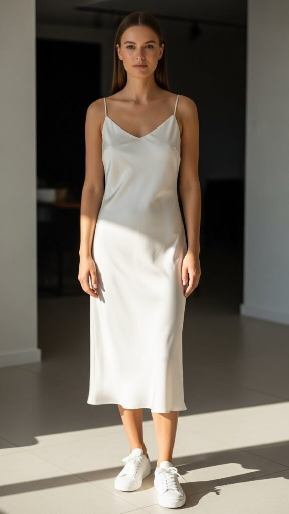 A satin slip dress screams elegance, but pairing it with sneakers brings it right back down to earth. This combo is peak cool girl energy, perfect for when you want to look effortlessly stylish without committing to uncomfortable shoes.