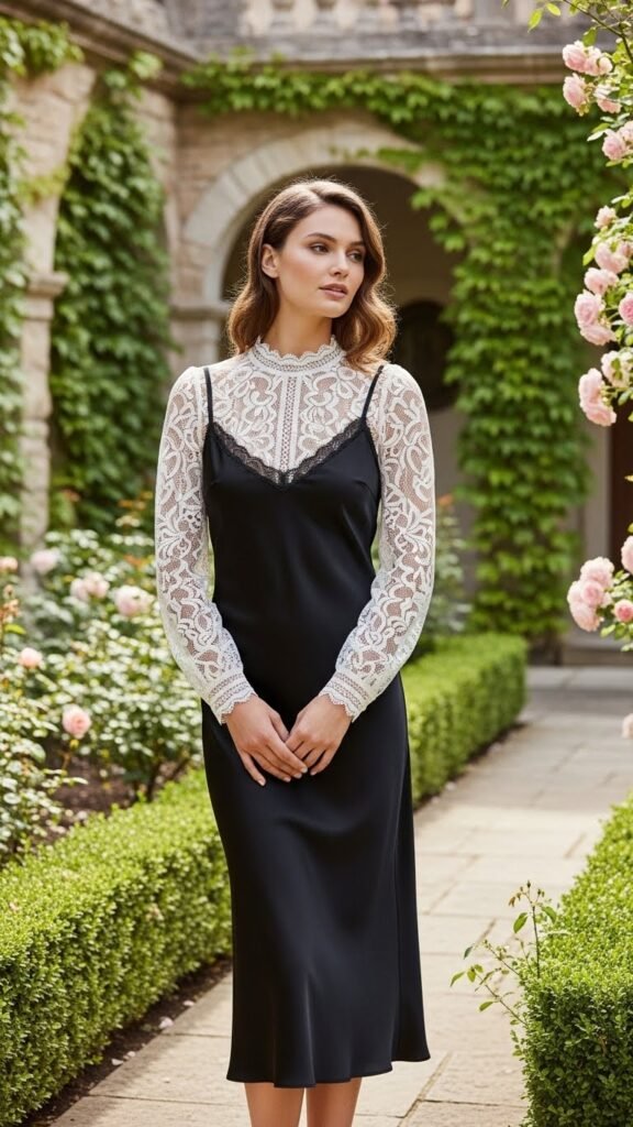 Layering a silky slip dress over a sheer, delicate blouse creates this unexpected romantic combination that looks like you spent hours planning but actually takes two seconds. The blouse peeks out at the neckline and sleeves, adding texture and visual interest. It’s giving modern romance with a vintage twist.