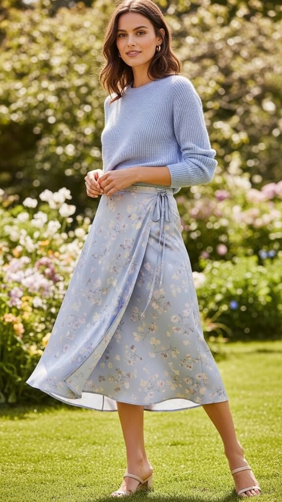 Wrap skirts deserve way more attention than they get. A midi wrap skirt in silk or satin with a subtle print, paired with a lightweight cashmere or cotton knit top in a complementary color, creates this gorgeous balance of dressy and relaxed. The wrap detail adds movement and flatters basically every body type.