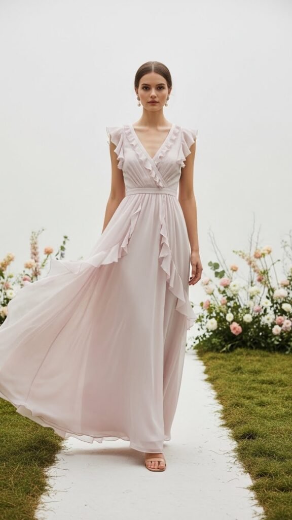 There’s something about a flowing maxi dress with ruffles that makes you feel like you’re floating through a scene in a movie. Choose one with subtle ruffle details at the sleeves, hem, or neckline rather than full-on ruffles everywhere. We want romantic, not explosion at a fabric store.
