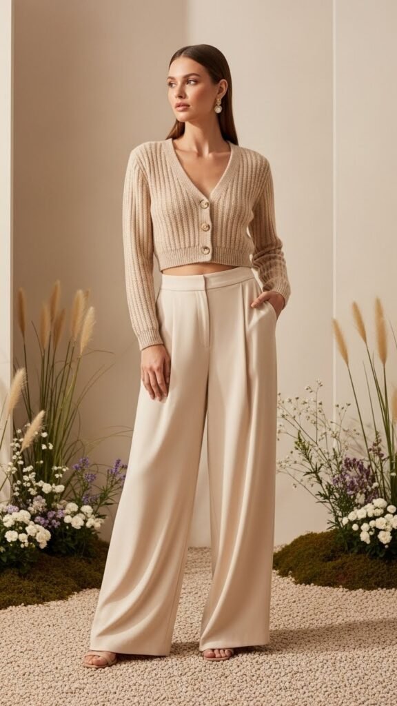 For those who prefer pants but still want that soft, romantic energy, this is your answer. Wide-leg trousers in a flowy fabric like crepe or lightweight linen, paired with a cropped cardigan in a complementary shade, creates a look that’s sophisticated yet whimsical. Wear the cardigan buttoned up on its own for a clean silhouette.