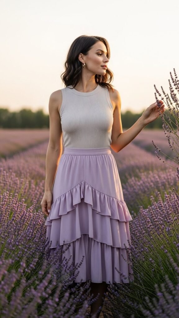 Sometimes the simplest combos hit the hardest. A tiered midi skirt with subtle ruffles paired with a fitted ribbed tank creates beautiful balance between volume and sleekness. The skirt does all the romantic heavy lifting while the tank keeps things grounded and modern.
