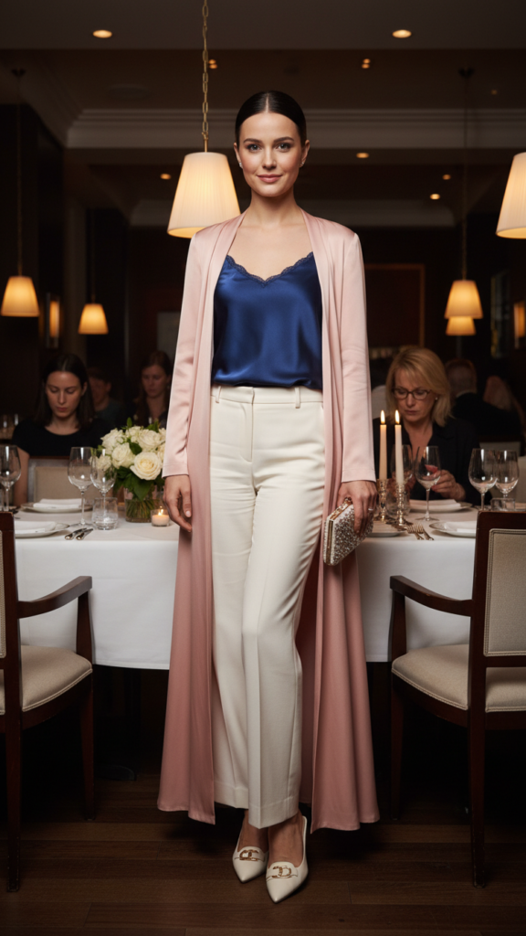 Choose a silk camisole in complementary tones—ivory, blush, or soft gray work beautifully. Layer a customized duster jacket over your ensemble for minimalist sophistication that photographs wonderfully. This versatile outfit moves flawlessly from dinner to after-party celebrations.