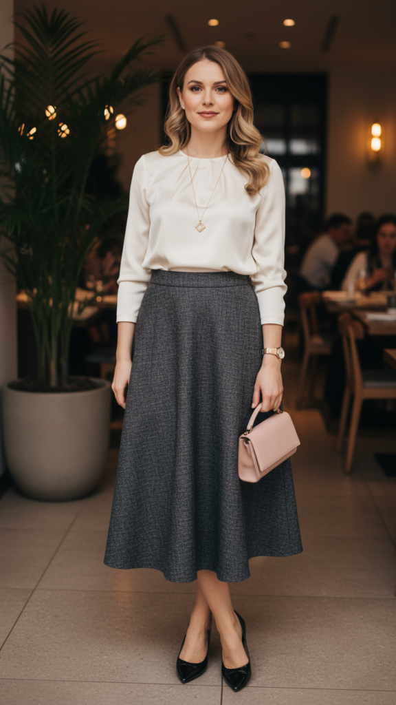Complete this refined look with stylish kitten heels or classic pointed flats for comfortable dining. These chic skirt outfits work beautifully for graduation events where you want to look both elegant and appropriate for the celebratory atmosphere. Keep minimal accessories—think delicate stud earrings and a simple watch. This versatile ensemble allows you to move freely while maintaining professional grace throughout your special evening celebration.