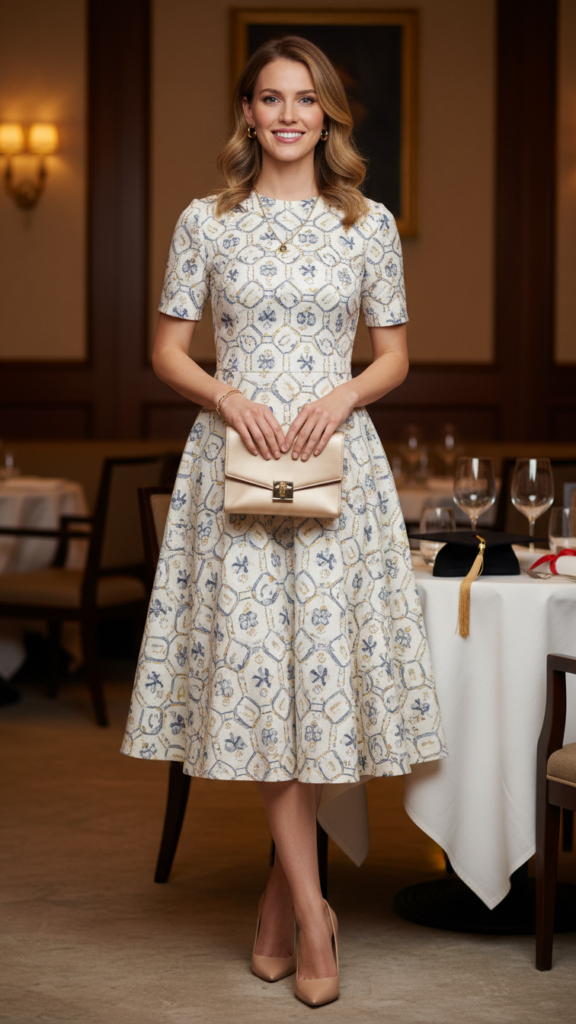 When you want to achieve timeless elegance with a touch of personality, an A-line dress featuring subtle prints becomes your perfect graduation dinner companion. Choose floral motifs, geometric patterns, or delicate polka dots that won’t overpower your sophisticated look.