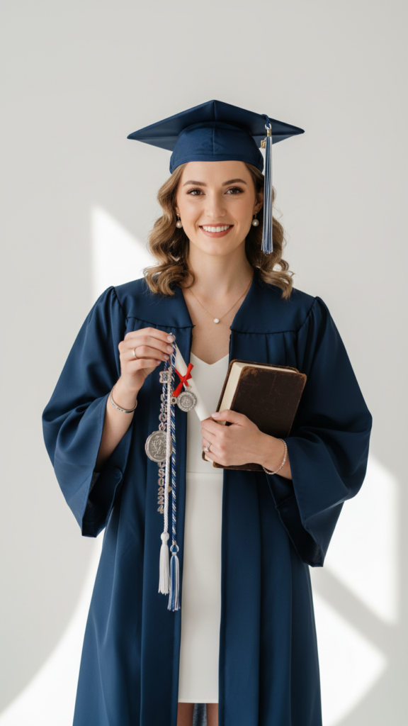 If your school uses navy blue, consider gold jewelry or cream-colored undergarments. For burgundy gowns, opt for silver accents or soft pink elements. When working with blue graduation attire, neutral accessories like pearl earrings or a classic watch create an elegant foundation that photographs beautifully. Lively color combinations work best when you choose one bold element and balance it with neutral tones.