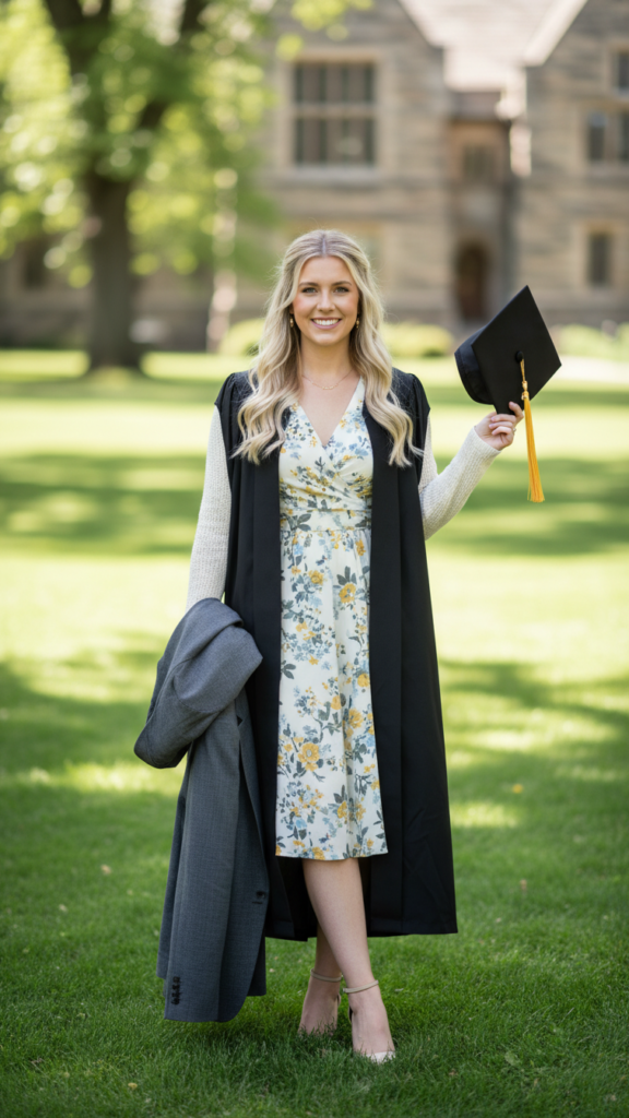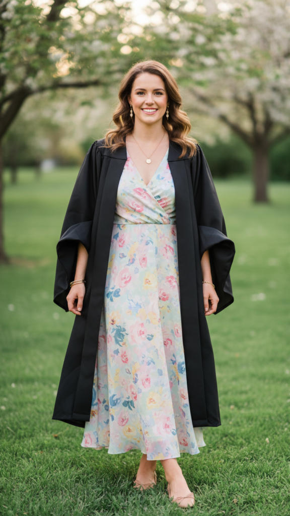 When spring graduation ceremonies call for something softer and more celebratory, a feminine floral dress becomes your perfect canvas for creating memorable photos. Choose romantic floral patterns in soft pastel shades like blush pink, lavender, or sage green that’ll complement your cap and gown beautifully.