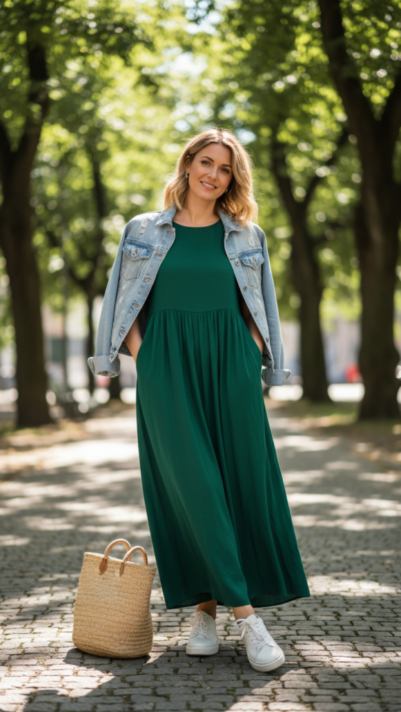 Maxi Dress With Denim Jacket and Sneakers