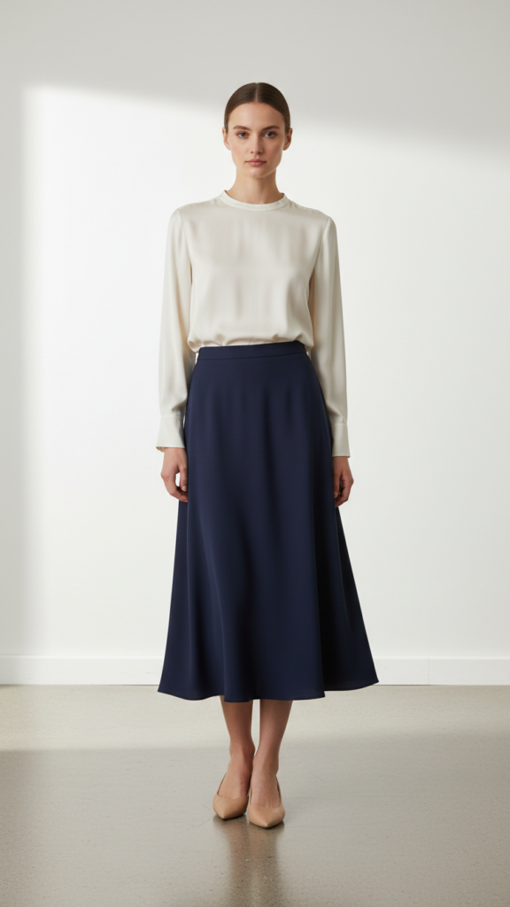 Midi Skirt With Silk Blouse and Pointed Flats