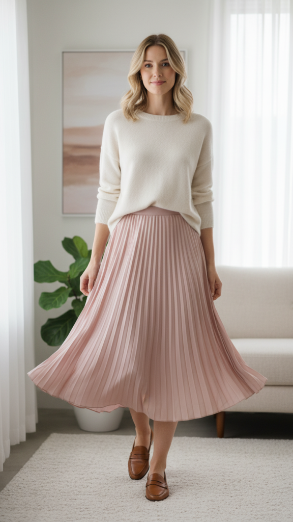 Choose neutral tones like cream, blush, or navy for versatile styling options that photograph well. Layer a cozy cardigan over your sweater for outdoor ceremonies or air-conditioned venues. Complete this polished look with chic loafers that provide comfort during long ceremonies while maintaining your refined aesthetic. This combination lets you move freely while looking appropriately dressed for your milestone moment.