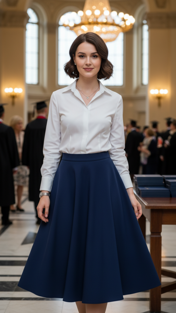 Choose an A-line skirt with subtle flouncy details at the hem for added movement and visual interest. Pair it with a customized white or light blue button-down shirt tucked neatly at the waist. This combination works beautifully for convocation ceremonies where you want to look polished and put-together. Complete your look with minimalist accessories like delicate stud earrings and a simple watch to keep the focus on your achievement.