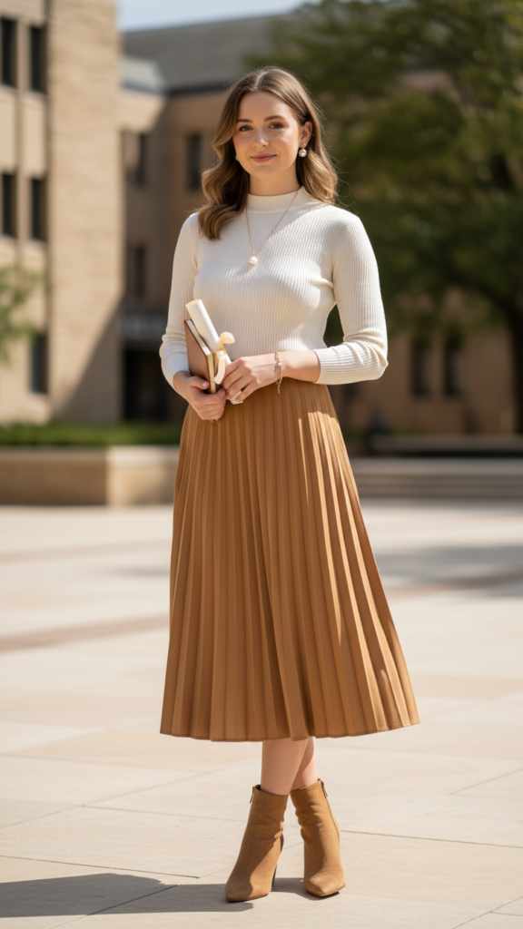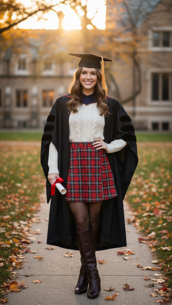 This cozy layered look works beautifully with A-line or pleated plaid skirts in classic colors like navy, burgundy, or forest green. Choose a fitted cable knit sweater that complements your skirt’s palette. Complete this timeless combination with knee-high boots or oxford shoes, and you’ll have an outfit that photographs beautifully while keeping you comfortable throughout graduation ceremonies.