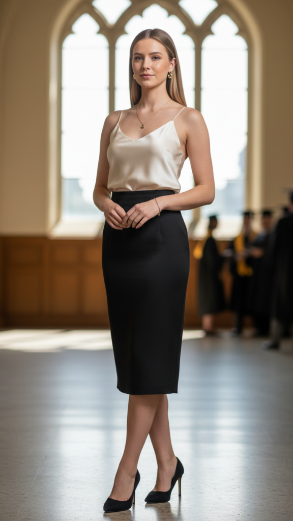 The silk camisole’s luxurious drape contrasts beautifully with the skirt’s structured lines. You’ll achieve a perfectly tucked in silhouette that lengthens your torso and defines your waistline. Consider adding a delicate halter neckline camisole for extra refinement, or layer with a lightweight blazer you can remove during photos. This refined appearance ensures you’ll look polished and sophisticated throughout your graduation ceremony. This versatile pairing shifts effortlessly from ceremony to celebration.