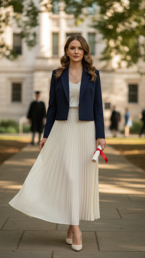 Pair it with a delicate lace blouse featuring subtle floral details for visual interest. This outfit works perfectly for outdoor ceremonies where you’ll want breathable fabrics. Complete the look with nude block heels and minimal jewelry. You’ll feel confident and comfortable while looking effortlessly put-together for your special day. This ensemble perfectly captures the stylish outfit essence needed for a fabulous graduation celebration.