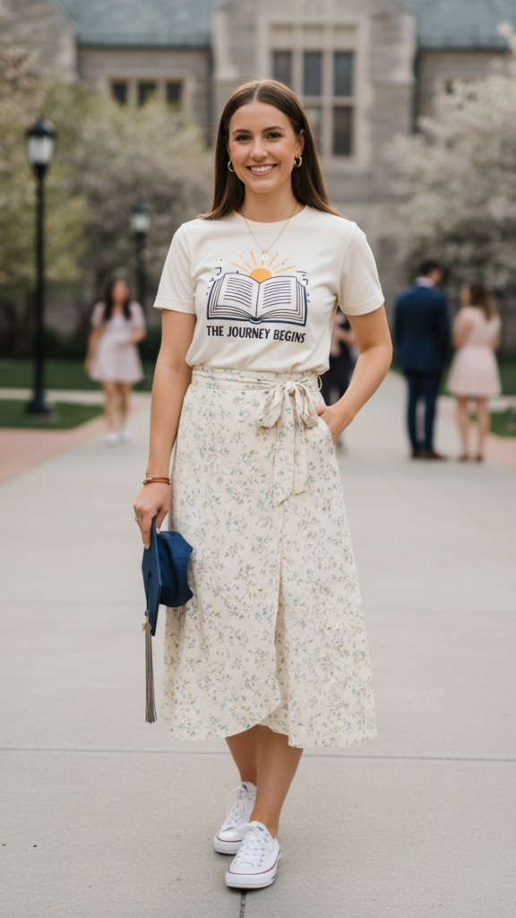 Casual charm takes center stage with a wrap skirt and tucked-in graphic tee combination that offers comfort without sacrificing style for your graduation day. This relaxed approach lets you express personality while maintaining ceremony-appropriate polish.