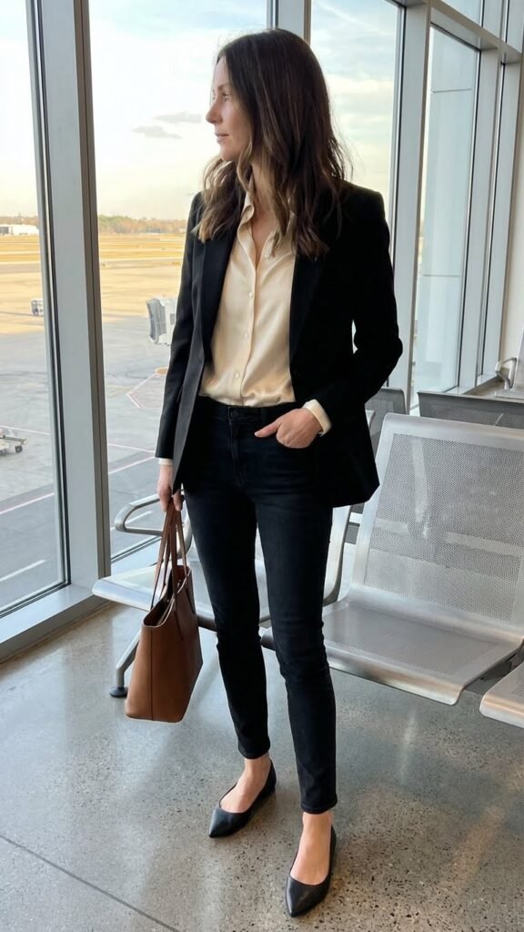 Bonus points if you add a leather tote and some layered necklaces. This look screams “I have my life together” even if you’re frantically searching for your boarding pass five minutes before takeoff.