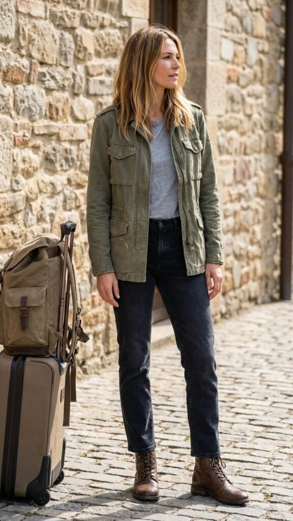 This outfit is for when you want to channel that effortlessly cool, slightly edgy vibe. A utility jacket (you know, the ones with all the pockets—because pockets are life) over a basic tee and straight or skinny jeans paired with combat boots is functional meets fashionable.