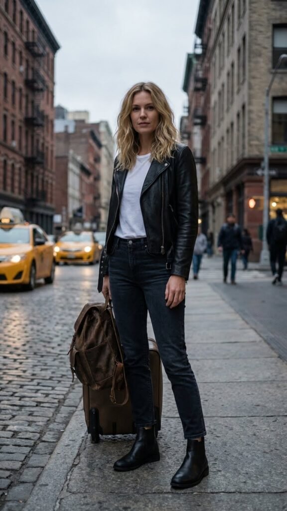 Start with your go-to jeans (black or dark wash looks especially good here), add a simple tank or tee underneath, and throw on a black or brown leather jacket. The fitted jacket balances out the casual vibe of jeans perfectly. Chelsea boots or loafers complete the look without making it too heavy.