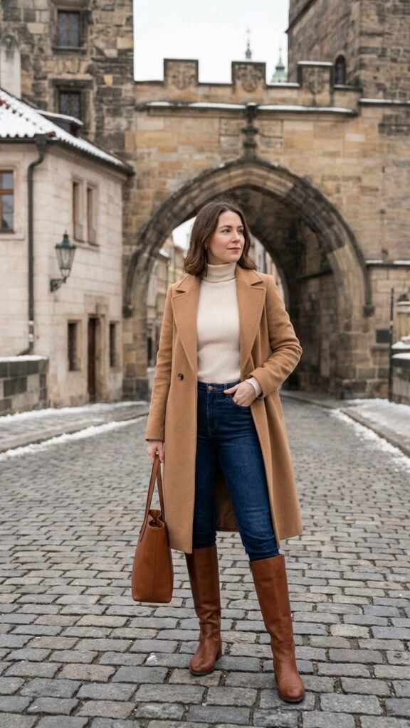 Is it even fall or winter travel if you’re not living in turtlenecks? This outfit is ridiculously chic and surprisingly practical. A fitted turtleneck tucked into skinny or straight-leg jeans paired with knee-high boots creates this long, lean line that’s incredibly flattering.