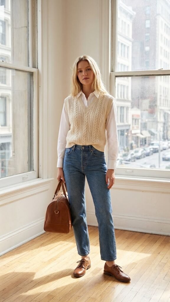 This one’s for my preppy fashion lovers out there. A sweater vest over a collared shirt tucked into high-waisted jeans is giving major Ivy League energy, but in the best way possible. It’s polished without being stuffy, and it’s surprisingly comfortable for long travel days.