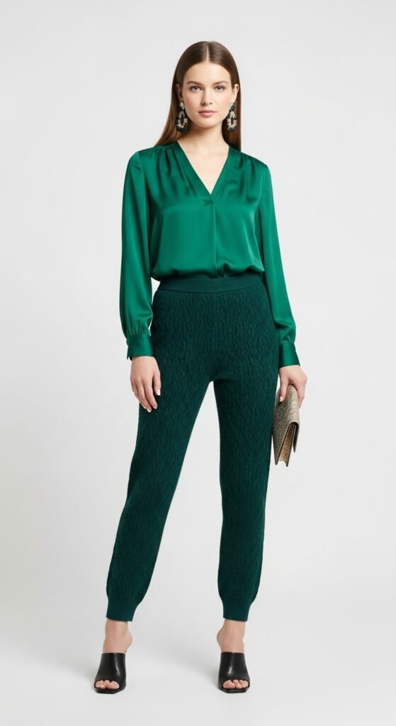 Choose a blouse in a jewel tone like emerald, burgundy, or navy for maximum impact. Tuck it into your high-waisted knit trousers and add heeled mules or strappy sandals. Throw on some statement earrings and a clutch, and you’re ready for anything that requires “smart casual” attire. The best part? You’ll be comfortable the entire time, which means you can actually enjoy yourself instead of counting down the minutes until you can change. That’s the real luxury, honestly.