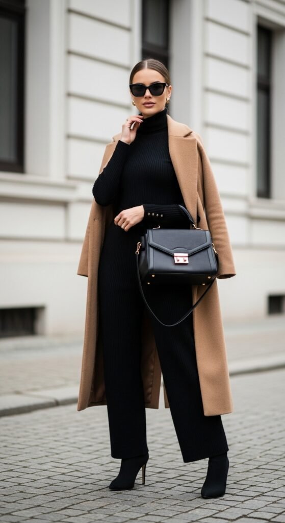 Go monochrome if you want to look extra pulled together. Think black on black or camel on camel for that effortlessly chic European vibe. Add a long coat, a structured handbag, and some heeled boots, and you’re serving sophistication. The beauty of this look is that it’s simple but impactful. No fuss, no overthinking, just pure style. And you can move freely, which is honestly the dream.