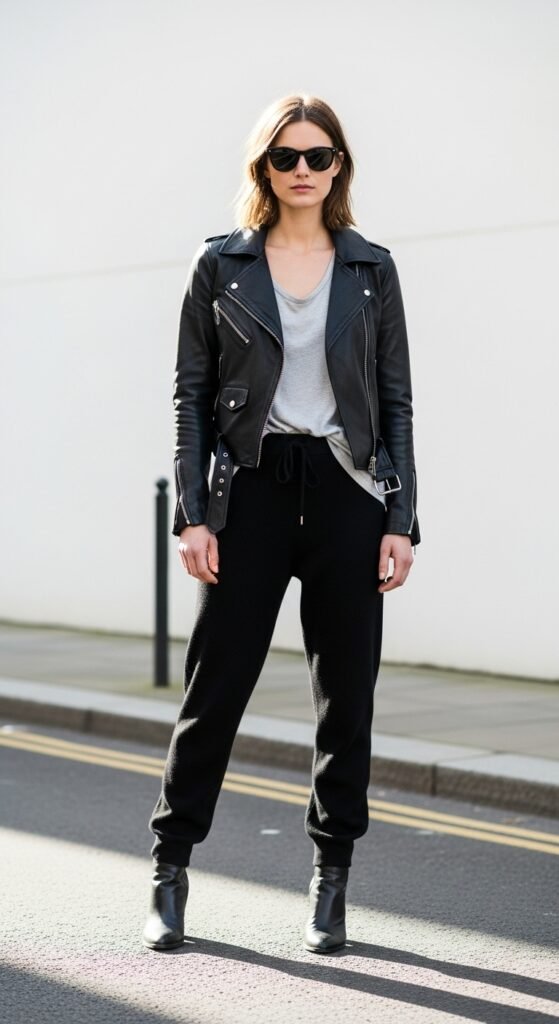 Pair your leather jacket with a simple tee or tank underneath, then add your knit trousers and ankle boots. Keep accessories minimal—maybe a delicate necklace or small hoop earrings. The leather jacket does all the talking here, so you don’t need much else. This look works for concerts, casual dinners, or anytime you want to feel like the main character. I once tried pairing loafers with this… let’s just say combat boots are the move here.