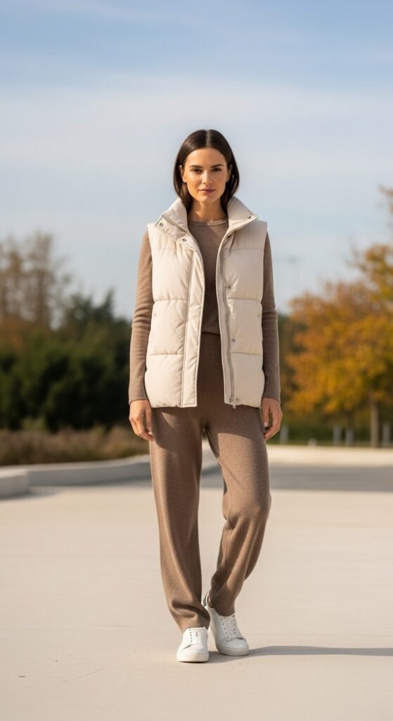 Go for a puffer vest if you want that sporty outdoor vibe, or choose a knit sweater vest for something more refined. Add a collared shirt underneath for extra polish, or keep it simple with a fitted turtleneck. Finish with sneakers or ankle boots. This outfit is practical, stylish, and works for basically any fall or winter activity. Plus, you can easily adjust your layers depending on the temperature, which is always a win.