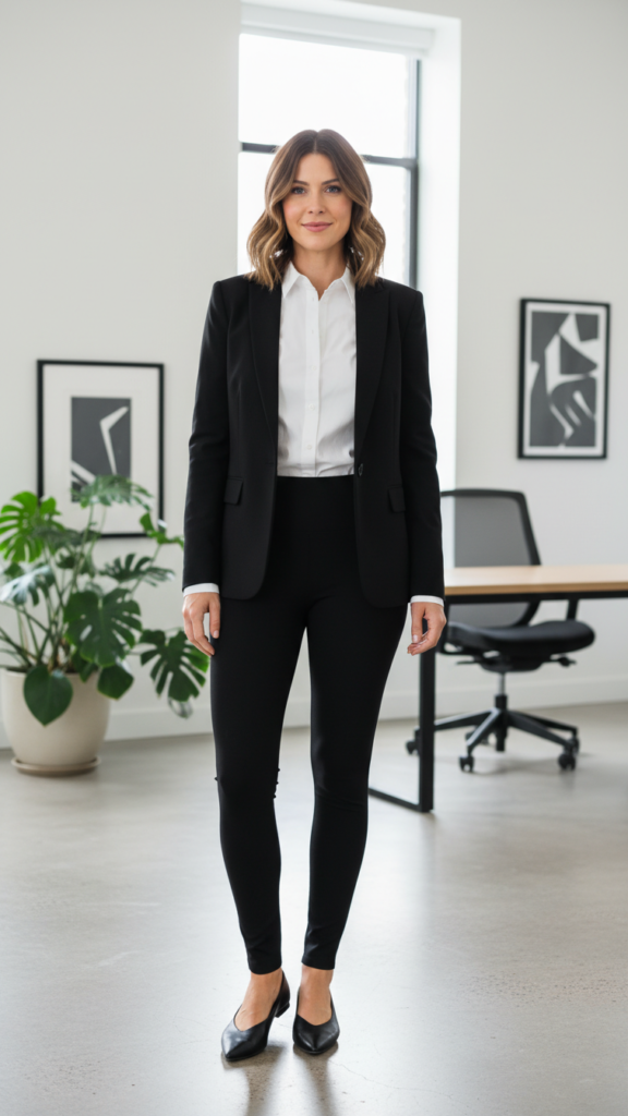 Choose a crisp collared shirt style in white or light blue, then add a structured blazer that hits at your hip. Tuck your shirt partially into high-waisted leggings for a balanced silhouette. Complete the ensemble with pointed-toe flats or low heels. A black blazer creates a timeless, powerful silhouette that commands respect in any professional setting. This versatile combination works across industries and seasons, letting you express professionalism without sacrificing comfort or personal style preferences.