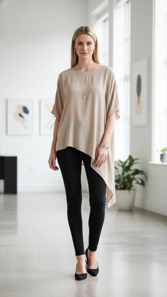Asymmetrical hem tops bring lively visual interest to your leggings ensemble while creating the perfect canvas for carefully chosen minimalist jewelry pieces. You’ll achieve effortless sophistication when you balance the top’s energetic lines with understated accessories.