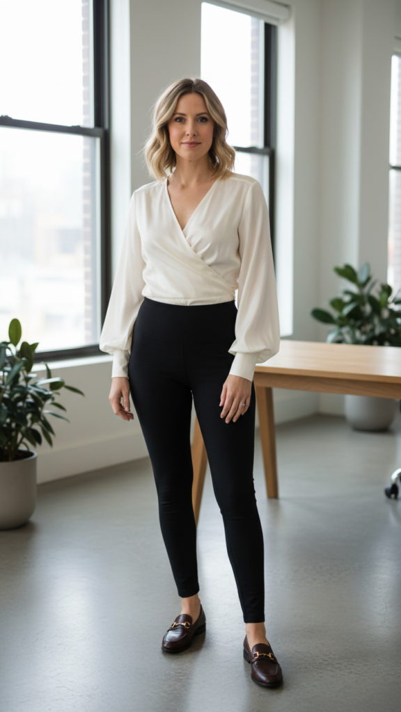 A wrap-style blouse creates an instantly polished foundation that alters your leggings into sophisticated office wear, especially when paired with classic loafers. You’ll find this combination strikes the perfect balance between comfort and professionalism.